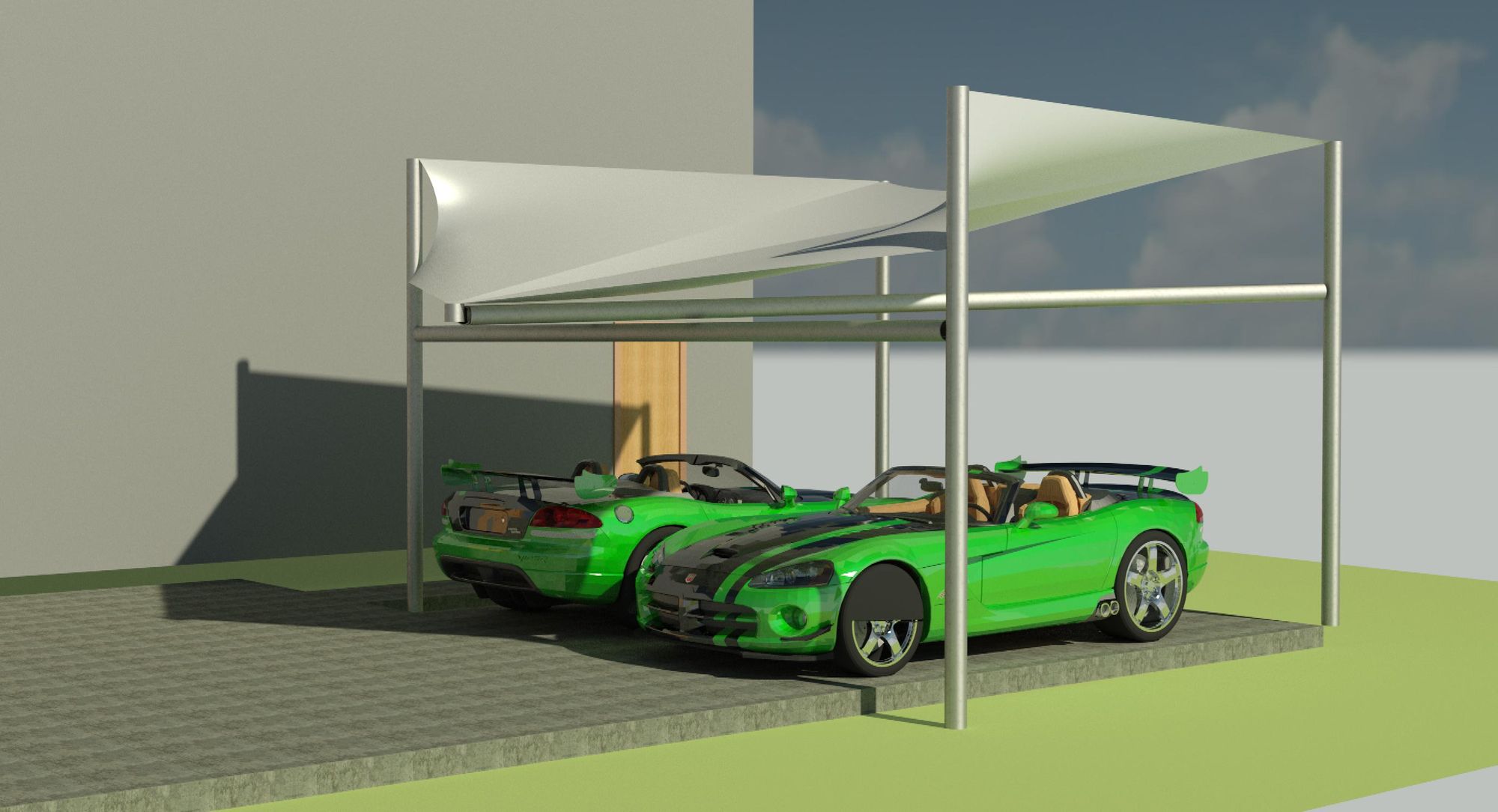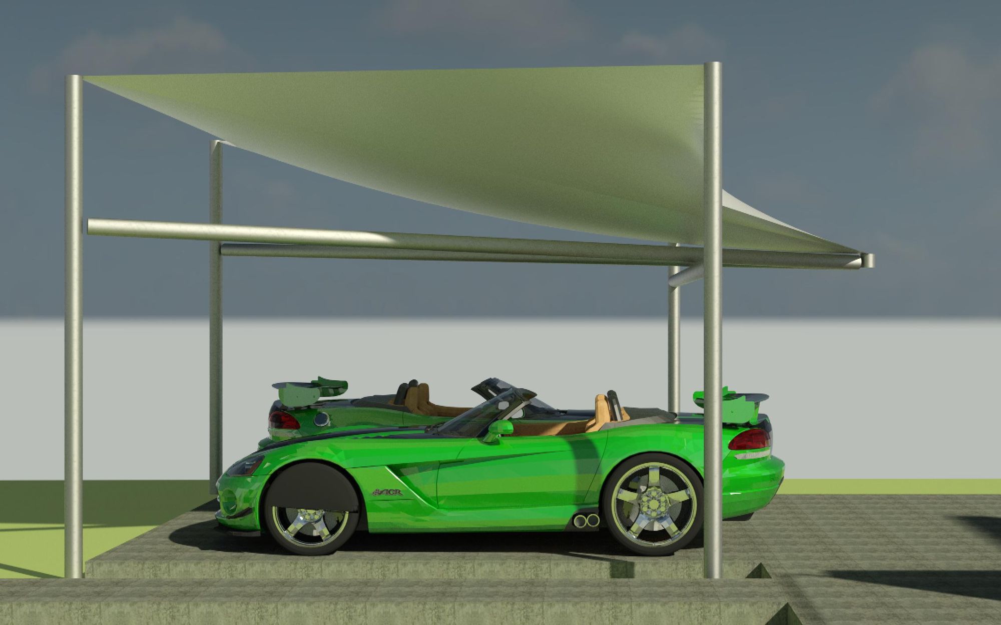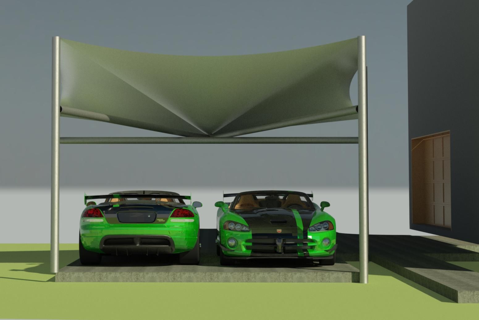 Inspired by Dodge Viper tail lines, this tensile fabric carport structure is easy to install and requires no foundation work except for pinning the structure to the ground. Structure can be calibrated to resist any major climate zone and local conditions.